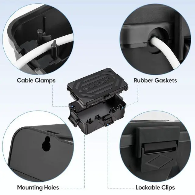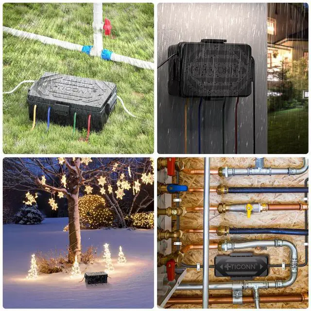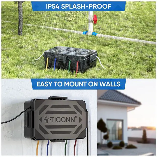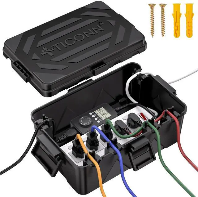The TICONN outdoor plug cover is IP54-rated for Splash-Proof protection, with cable clamps and rubber seals; It withstands temperatures as low as -40°F and protects against harsh weather; It fits power strips, timer outlets, and bulky adapters, with six sealed cable entries and includes 2 expansion screws, 10 cable ties, and adhesive strips; Made from durable, UV-resistant PP material, it can hold up to 600 pounds; Easy to use with four latches, it can be wall-mounted or placed on the ground; TICONN offers a 30-day money-back guarantee for risk-free shopping