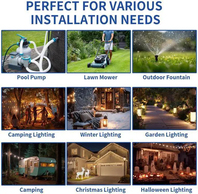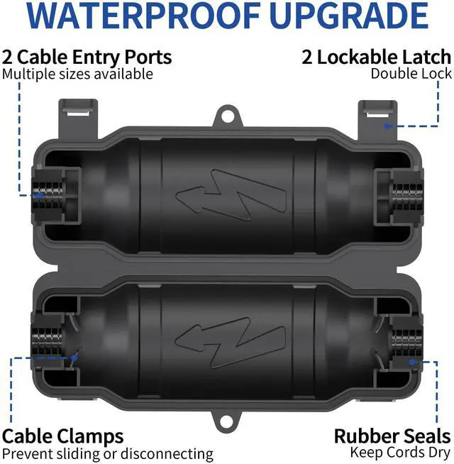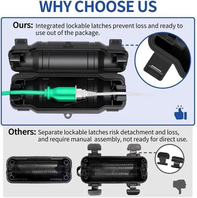 Versatile: External size 2.51"×3.24"×7.45", inner size 2.28"×2.32"×6.4", fits 12/14/16 gauge cords and most standard 3-prong/polarized 2-prong plugs for safe, secure connections Upgraded 2 lockable latches: Simplified operation with 50% fewer latches than traditional 4-latch designs, reducing breakage risk; complete with 2 cable clamps, mounting holes, and rubber gaskets to create a watertight sealing space for dry, secure outdoor connections Hinged one-piece design with integrated locking system: Top and base come pre-attached with no assembly required, while built-in latches eliminate detachable buckles, thereby preventing loss or misplacement unlike traditional separate 4 lockable latches High Quality Material: The extension cord cover is made of heavy duty weather-resistant plastic to withstand rain, snow, water, dust, dirt and more, continuously protecting outdoor connections from electrical hazard; not designed for full submersion in water Suitable for both Indoor & Outdoor Use: Lawn and garden power tools, Christmas holiday lighting, landscape decorations, pool pumps, fountains, fish ponds, patio heaters, air conditioners, security cameras, construction sites and more Compatibility: This extension cord box cannot fit for power strip, right-angle plug and large adapter