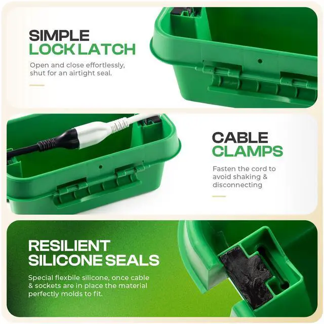 The medium SOCKiTBOX features one line in and four lines out, making it the perfect temporary protector for multiple timers, extension cords, transformers or power strips. Use it to block rain, snow, dirt and dust from any socket or hookup, ensuring utmost safety for your holiday and landscape lighting, patio heater, fountain pump, power tools and other electrical gear.