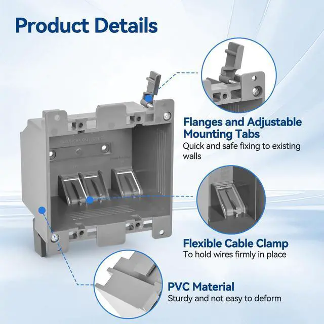 ![]() 2gang old work outlet box | ![]() 1gang old work outlet box | ![]() 1gang new work outlet box | ![]() 2gang new work outlet box | ![]() New Work Ceiling Box | ![]() Old Work Ceiling Box | ![]() Ceiling Fan Box |