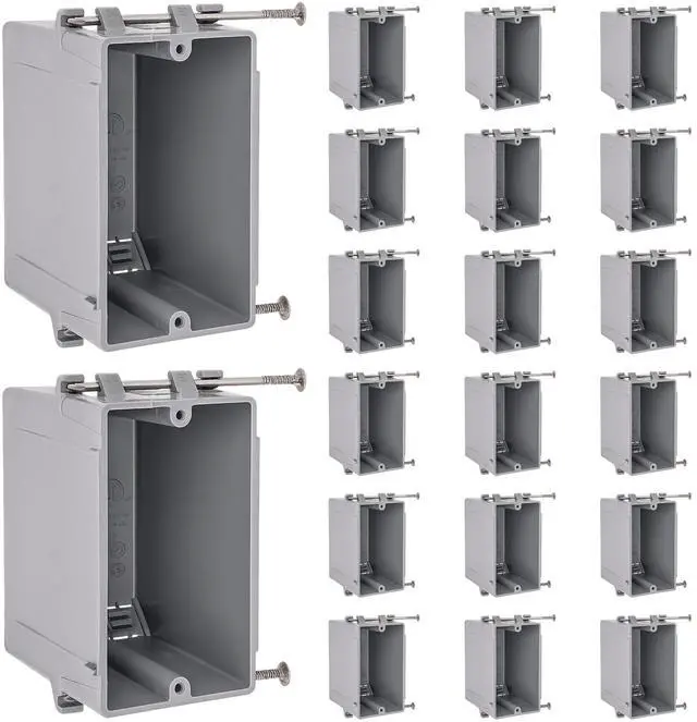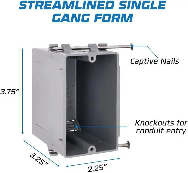 The OHLECTRIC Deep Switch Outlet Box is expertly engineered for durability, safety, and ease of installation, making it the perfect choice for residential and light commercial electrical applications. Constructed from high-performance PPO plastic, this single gang electrical box delivers exceptional strength, impact resistance, and long-term reliability in demanding environments. Purpose-built for new work installations, it features integrated captive nails for quick, secure mounting directly onto wooden studs. The box offers a generous 20 cubic inch capacity, allowing ample space for multiple non-metallic sheathed cables, while four pre-formed knockouts provide versatile wiring entry points for clean and efficient configurations. Safety is a top prioritythis box is ETL-listed and fire-rated for 2 hours, delivering proven protection that meets strict fire-resistance standards. Compatible with standard non-metallic wiring systems, this deep outlet box supports a wide range of applications, including switches and receptacles. Our OHLECTRIC box combines performance and appearance to meet the highest installation standards. Choose OHLECTRIC for a dependable, code-conscious solution that simplifies your electrical work while ensuring safety, efficiency, and long-lasting results