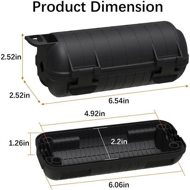 Product Dimensions: The outdoor junction box is light and compact in size, external length not counting the hook is 6.06 inches, external diameter is 2.52 inches. The internal length from the waterproof seal to the other end is 4.92 inches and the internal radius is 1.1 inches.