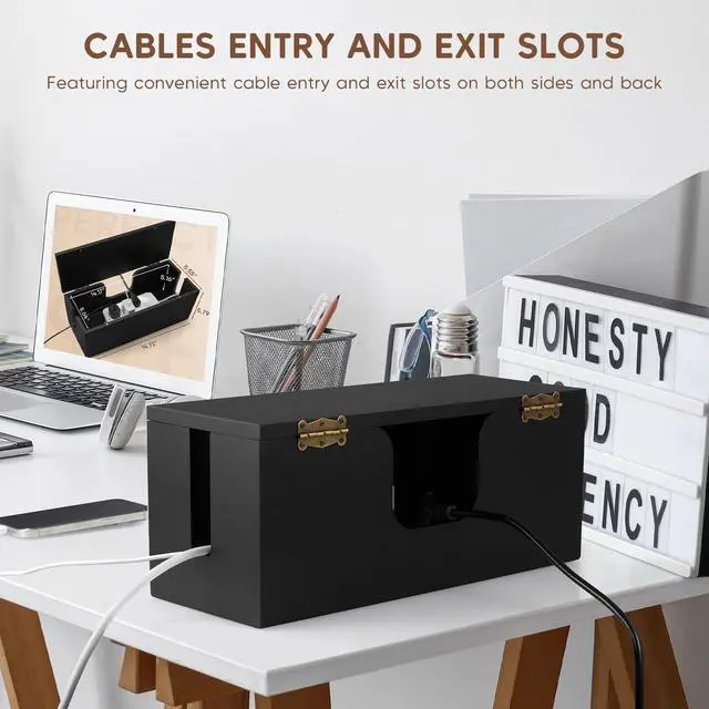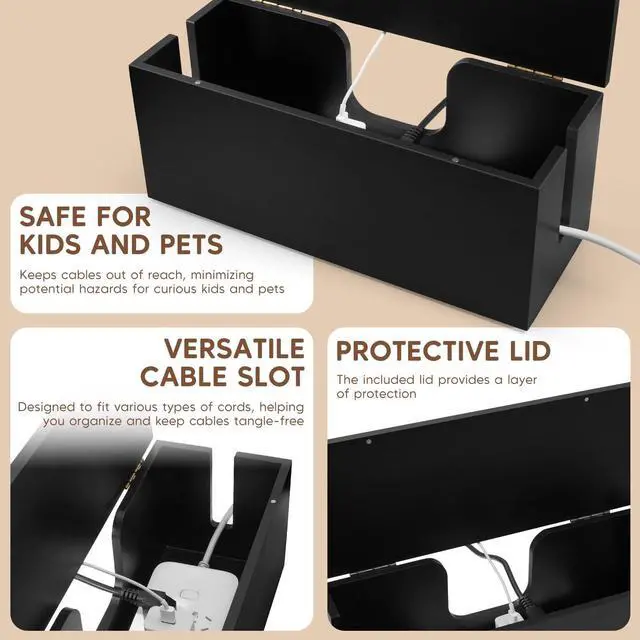 Large Cable Management Box - Wood Cable Organizer Box and Power Strip Box for Electrical Cord Management - Hide Desk Cord and Floor Cables - Wire Storage and Organization for Cords, Black