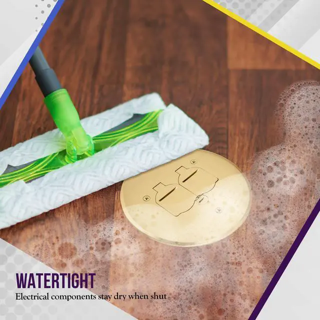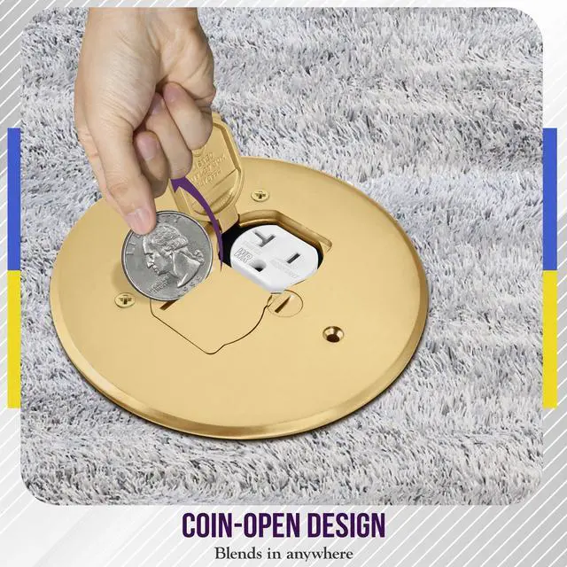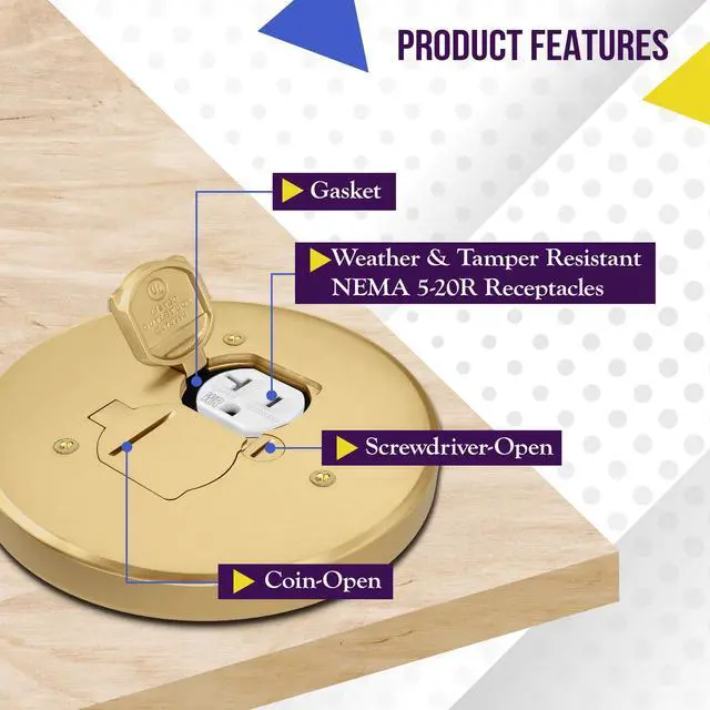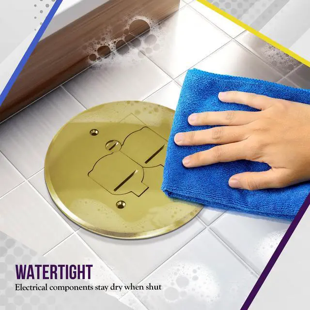 The cover thickness is approximately and is corrosive resistant. The openings for this floor box can be accessed using a coin, such as a quarter, or a flat-head screwdriver. Each port is made to protect against liquid spills.