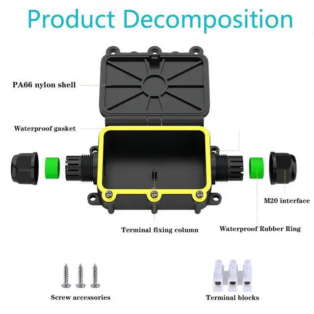 The outdoor junction box is made of PA66 nylon material, with a high IP68 waterproof rating, dust-proof, sun protection, corrosion resistance, long service life, and no cracking.