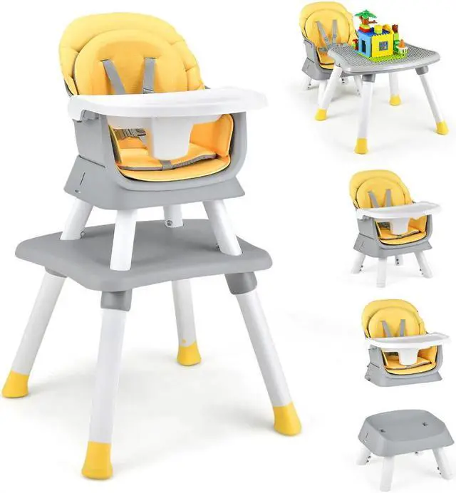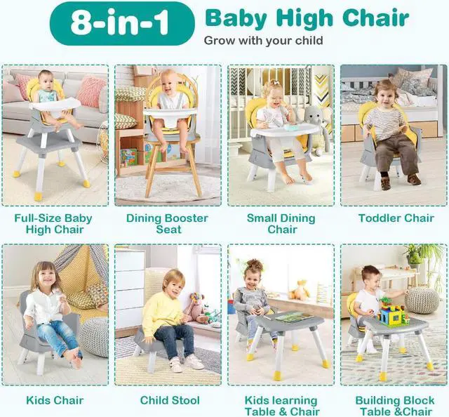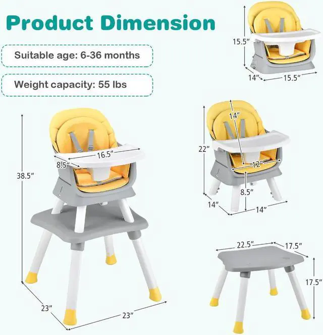6-in-1 Baby High Chair: This multi-functional highchair can be easily converted into various modes: full size baby high chair, dining booster seat, toddler chair, child stool, kids table and chair, building block table and chair. The table top has a grooved side and a smooth side for different uses. Suitable age: 6-36 months.