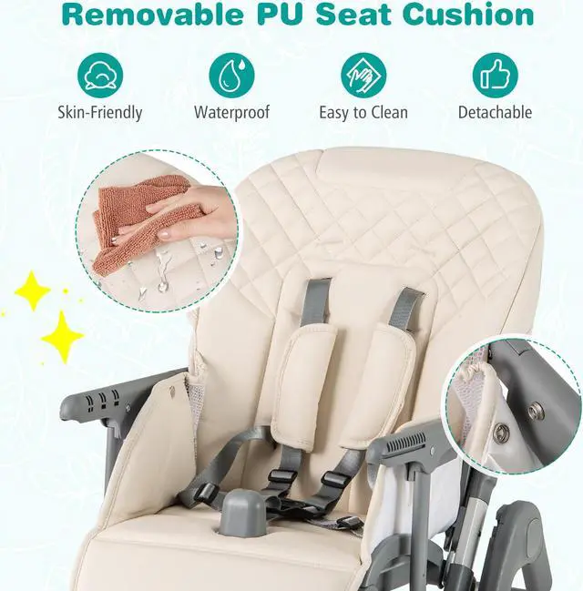 Easy to Clean: Featuring a removable food tray and a skin-friendly, waterproof PU seat cushion, this high chair simplifies cleanup. The detachable components allow for quick, hassle-free cleaning after messy meals, ensuring a hygienic environment for your child's every use.