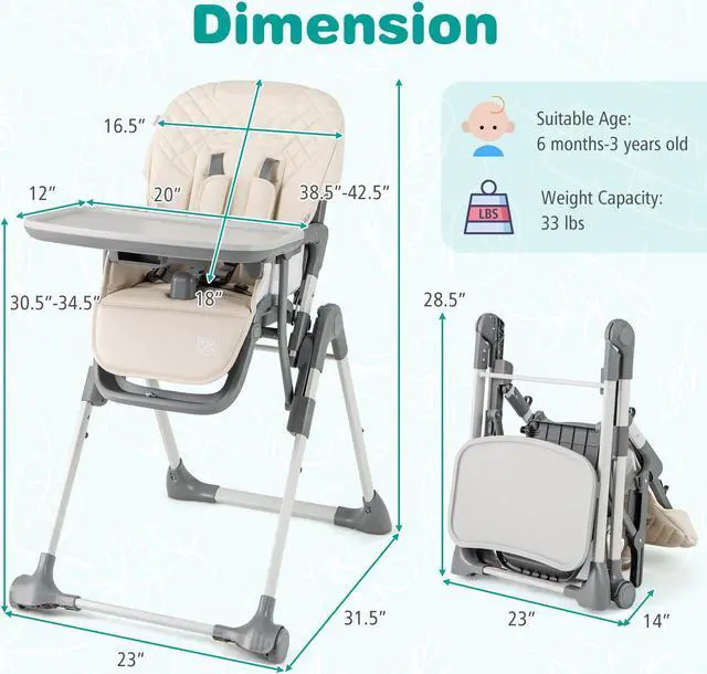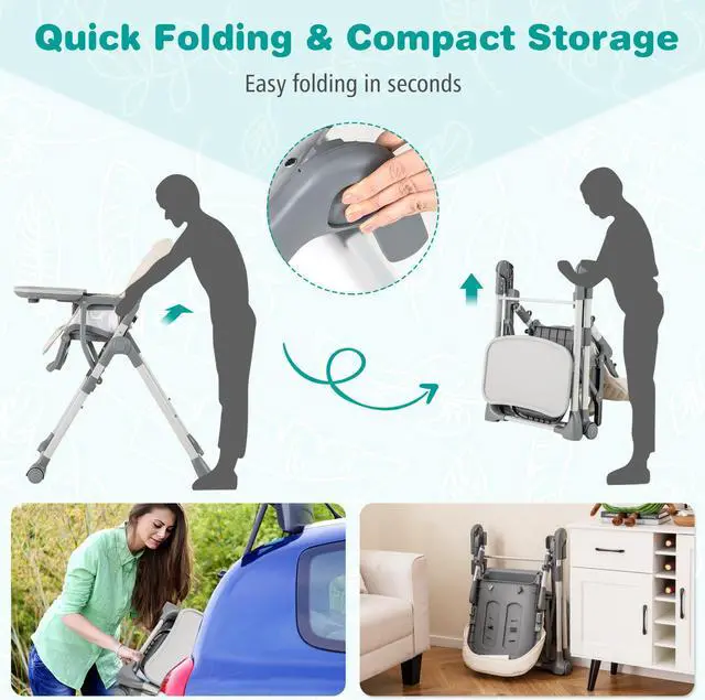 Quick Folding and Compact Storage: The foldable structure provides easy folding in seconds and helps store the chair when not in use, or transport it for use on the go. The highchair comes pre-assembled and requires no installation, ready to use.