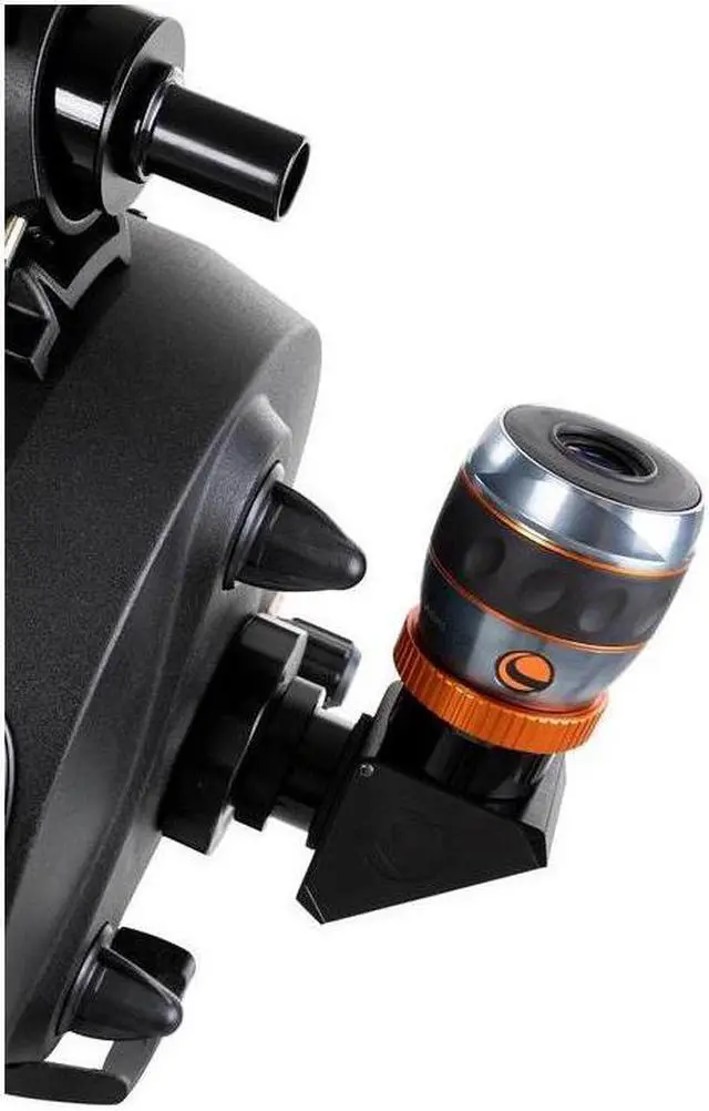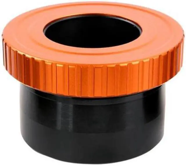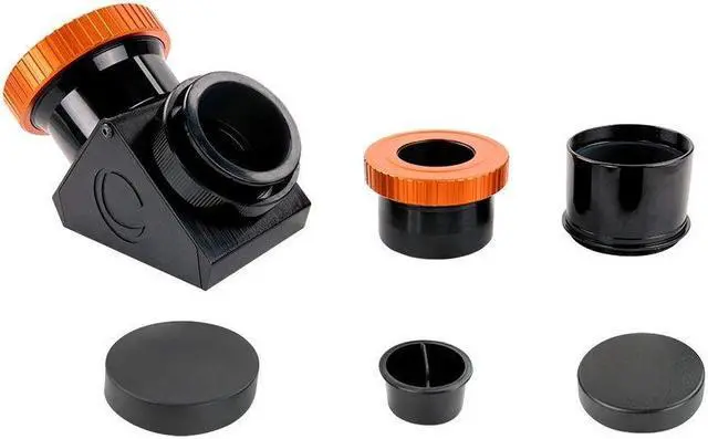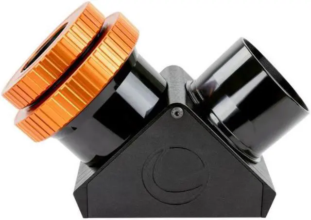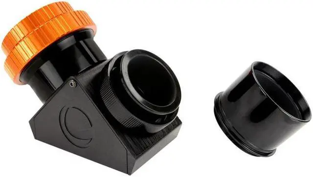 Crafted from machined black anodized aluminum, all mechanical parts of the diagonal are robust and durable. The twist-lock rings are orange anodized for easy visibility. The interior of the Schmidt-Cassegrain adapter and 2" barrel are threaded and painted flat black to prevent glare, ensuring an uninterrupted viewing experience. This diagonal also comes with two interchangeable barrels, offering versatility in connecting to a wide range of telescopes without additional adapters. The Celestron Dielectric Star Diagonal, 2" with Twist-Lock, stands out in terms of reflectivity and optical quality, delivering top performance with an over 99% reflective mirror and diffraction-limited optical quality.
