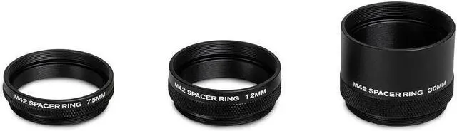 RASA 8 optical tubes: - The 7.5 mm ring provides proper spacing with RASA 8 for many ZWO cameras. - The 12mm ring offers correct spacing with RASA 8 for numerous Atik cameras. - The 30mm ring converts ZWO camera with a filter slider to a 55mm back-focus standard for use with Schmidt-Cassegrain & EdgeHD. With the M42 Spacer Ring Kit, you can enhance your astrophotography experience, ensuring high-quality, precise images every time.