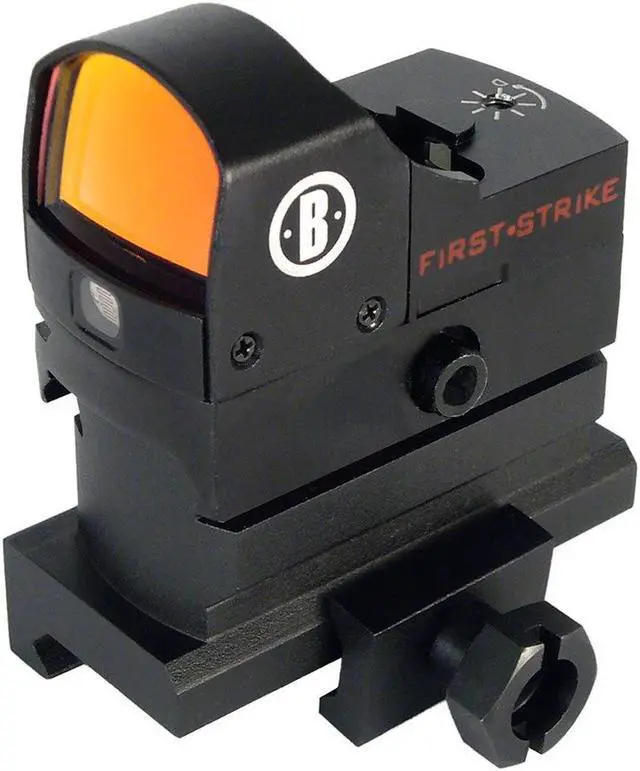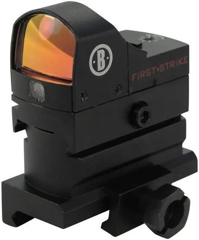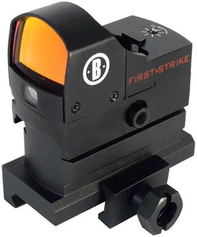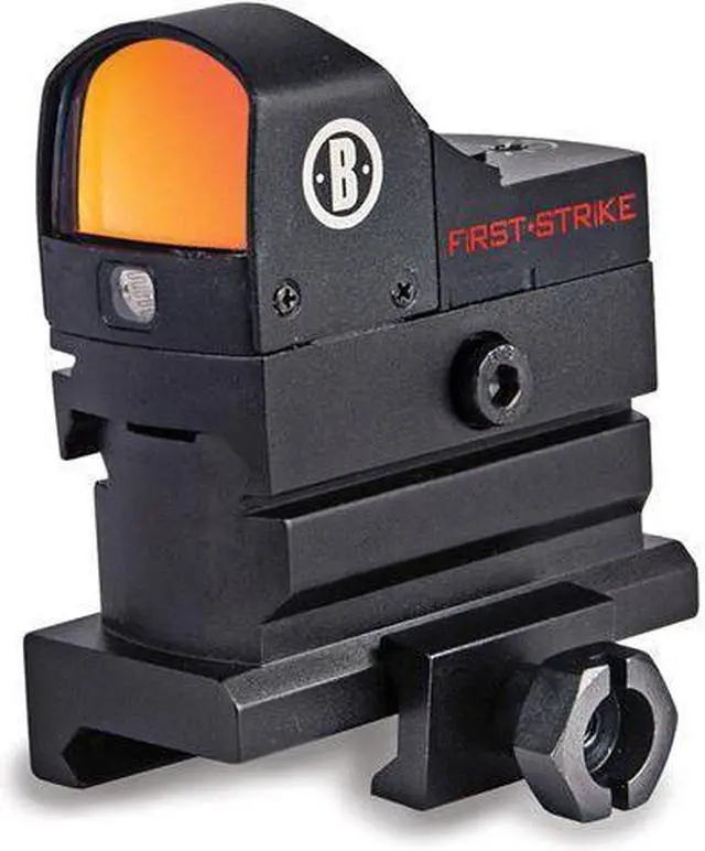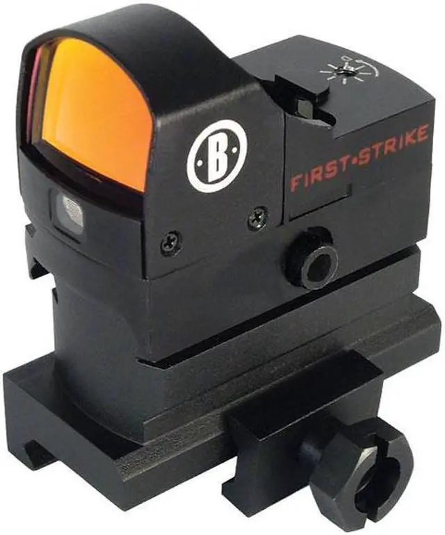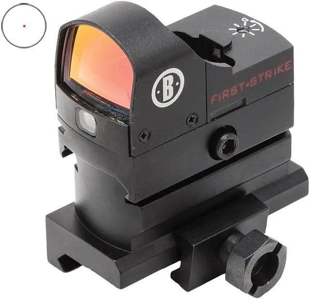 For handguns, shotguns or rifles, this compact model comes fully waterproof and shockproof, with self-regulating brightness. The pinnacle of red dot aiming solutions, with blazing fast target acquisition, peak accuracy and bright enough to hunt even the thickest woods. The 5 MOA Red Dot features multi-coated optics to deliver the ultimate confidence boost in low light and it conserves battery life by self-regulating brightness based on available light and power down when the protective storage hood is attached. Lightweight at only 2.1 ounces, the super-low-profile First Strike HiRise travels light on any tactical firearm, with an integral mount and riser block to position the sight at optimum height and attach easily to your items mount. Features include 5 MOA, matte finish, multi-coated optics, self-regulating brightness, integrated mount, and 100% waterproof/fog proof/shockproof construction. Operates on one CR2032 battery which is included.•5 MOA Red Dot•Matte finish•Multi-coated optics•Self-regulating brightness•100% waterproof/fogproof/shockproof construction•CR2032 battery•Compatible with Weaver/Picatinny mounts•Protective Hood Included•Field of View (ft@100 yds. / m@100 m):Unlimited•Weight (oz. / g):2.1 / 61•Length (in. / mm):2 / 52•Adj Range in.@100yds / m@100m:90 / 2.3•Mounting Length (in. / mm):2 / 50