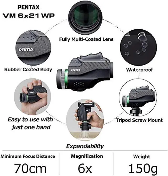 Discover the VM 6x21 WP Monocular, a high-performance optical device from Pentax that's designed for effortless, single-handed operation. This compact and lightweight monocular is easy to use and ergonomically designed for comfort and ease of operation. It offers a bright, clear view with high contrast, thanks to its excellent optical performance and fully multi-coated optics. The VM 6x21 WP Monocular is not just compact and easy to handle, but also robust and reliable. It's waterproof up to 1 meter, making it a perfect companion for outdoor adventures in all weather conditions.