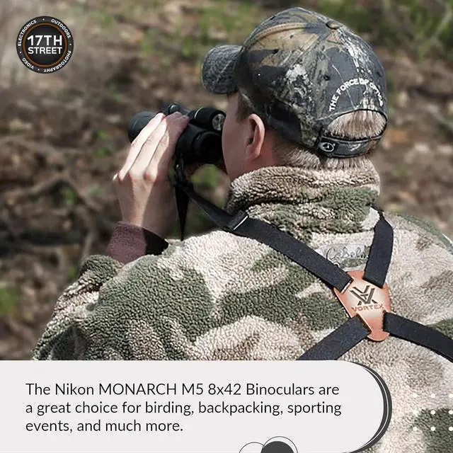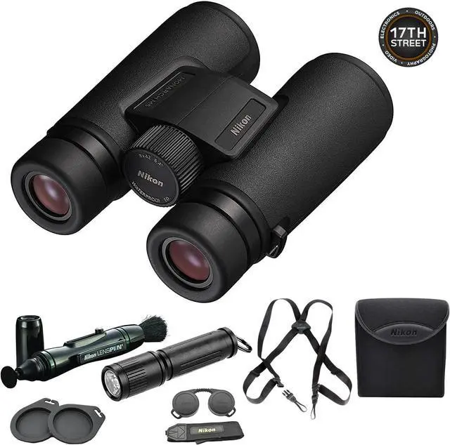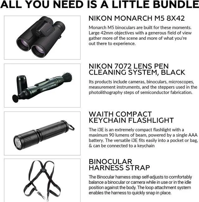 The Nikon Monarch M5 Bundle Pack includes a high-quality and ultra-durable Binocular Harness Strap, Nikon Lens Pen Cleaning System, and a very powerful 90 Lumens Waith Flashlight. All these products help you to use your precious binoculars.