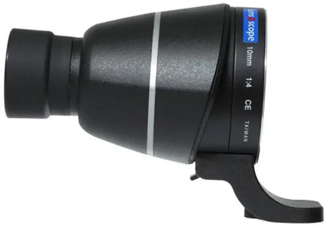 Focus is easily achieved by using the lens' manual focus ring. There are two versions of the LENS2SCOPE, a straight eyepiece (pictured) and a version where the eyepiece is angled up. They are both available in Canon EOS, Nikon, Pentax and Sony. The LENS2SCOPE has a removable tripod adapter for mounting onto a tripod for more comfortable viewing for extended periods of time. The tripod mount can support up to 800g. If you want to use a lens heavier than 800g, please use a tripod mount on the lens. This small accessory comes with its own carrying case and takes up about as much room in a camera bag as a normal lens.
