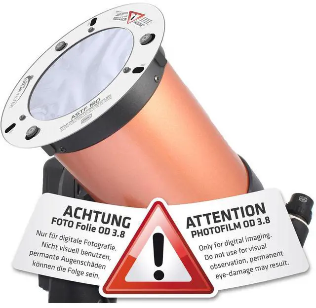 The Baader Digital Solar Filter with PHOTO-Film OD 3.8 is a development made possible after the product launch of our Baader Solar Filters OD 5.0 in spring 2015. The filter has the same cell and mechanical specifications as our ASTF-Filter with Safety Film OD 5.0, the only difference lies within the used AstroSolar Film - our AstroSolar PHOTO Film OD 3.8 which has proven itself over the years. This film allows shortest exposure times - mainly used for digital videography and the lucky imaging technique - and thus almost "freezes" turbulences in the earths atmosphere. AstroSolar PHOTO Film OD 3.8 is NOT intended to observe the sun, only for digital imaging! Many ready made filters do stretch the filter material like a drumhead in order to make it look like a piece of glass - this absolutely does destroy the image quality, rendering the film useless for high magnification work.