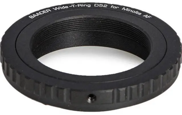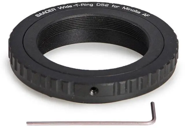 Bring your astrophotography to the next level with the Baader Wide T-Ring Set, meticulously engineered to seamlessly connect your Minolta DSLR camera to the Astro T-2 system. This high-quality, durable T-Ring set is a must-have accessory for Sony Alpha/Minolta Maxxum camera owners, offering a versatile and easy-to-use solution for attaching a wide-angle lens and expanding your photographic horizons. Crafted by Baader Planetarium, a leader in optical innovation, the Wide T-Ring features an S52 dovetail in addition to the integrated T-2 ring. This dual design not only enhances the connection stability but also provides the flexibility to modify the T-ring.
