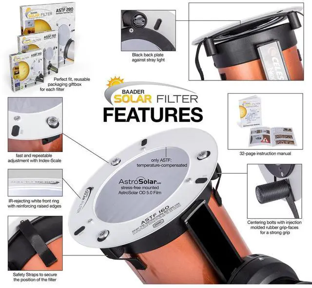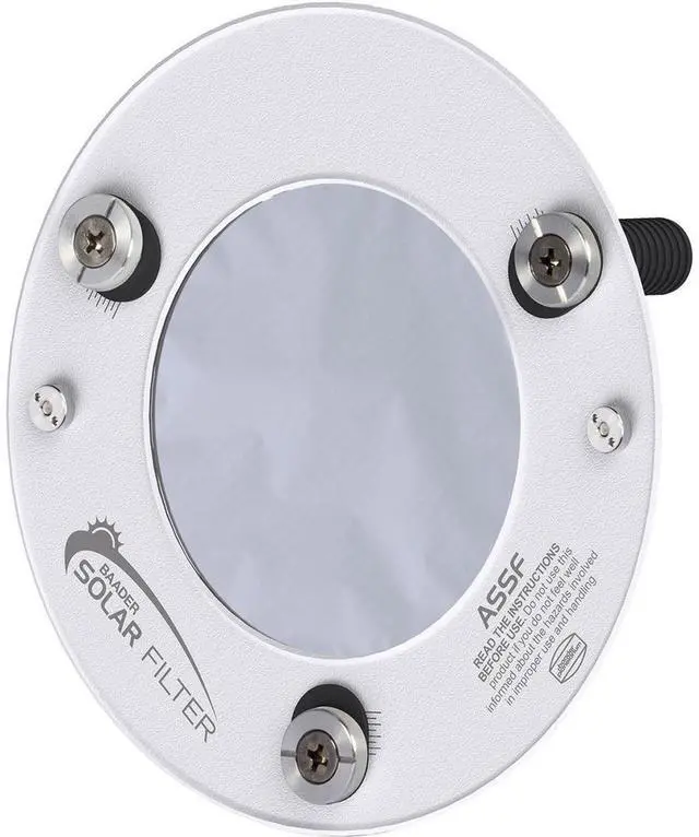 AstroSolar must be mounted entirely stress free in order to perform like a high precision plane optical window. It sounds like a contradiction with traditional perception of quality, but AstroSolar must show slight ripples! Only when the film is being put under stress by an improper cell mount it performs just like any single side coated glass-filter made of untreated float glass. Original Baader AstroSolar Safety Film (OD 5.0 ), cell mounted and quality inspected by skilled members of their staff Clear white IR-rejecting front ring with reinforcing raised edges along the outer and inner circumference, designed to protect the solar filter material from contact with any sharp metal edge No tool mounting and adjustment of the centering bolts to fit a wide variety of mechanical tube diameters.