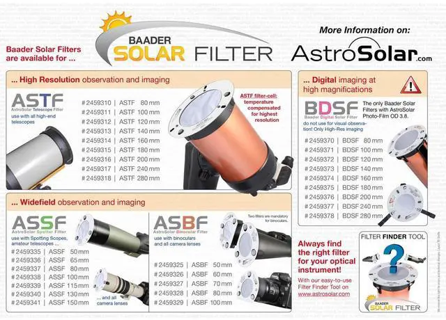 Mounted Filters with Baader AstroSolar Safety Film OD 5.0 After 15 years of offering AstroSolar film sheets as DIY-product, this system of Baader Solar Filters is designed to retain the true optical quality of the diffraction limited AstroSolar Safety Film. Baader Solar Filters provide a professional and secure solution to observe and image the Sun using AstroSolar Safety Film OD 5.0. Many ready made filters do stretch the filter material like a drumhead in order to make it look like a piece of glass - this absolutely does destroy the image quality, rendering the film useless for high magnification work.