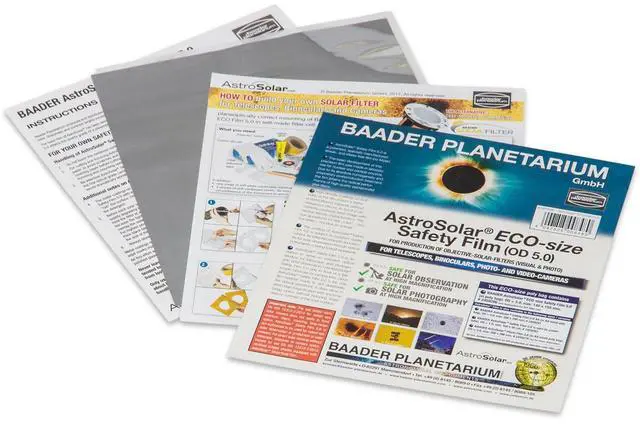 This film is crafted from the same high-grade material as the proven AstroSolar Safety Film 5.0 in A4-size. Due to popular demand, it is now available in a more compact and economically priced ECO-size. It's an ideal choice for outfitting small telescopes, finders, binoculars, spotting scopes, and camera lenses with a professional-grade solar filter. Whether you're a seasoned astronomer or a photography enthusiast looking to safely explore the sun, the AstroSolar ECO-Size Safety Film is an essential tool for your observational and imaging arsenal.