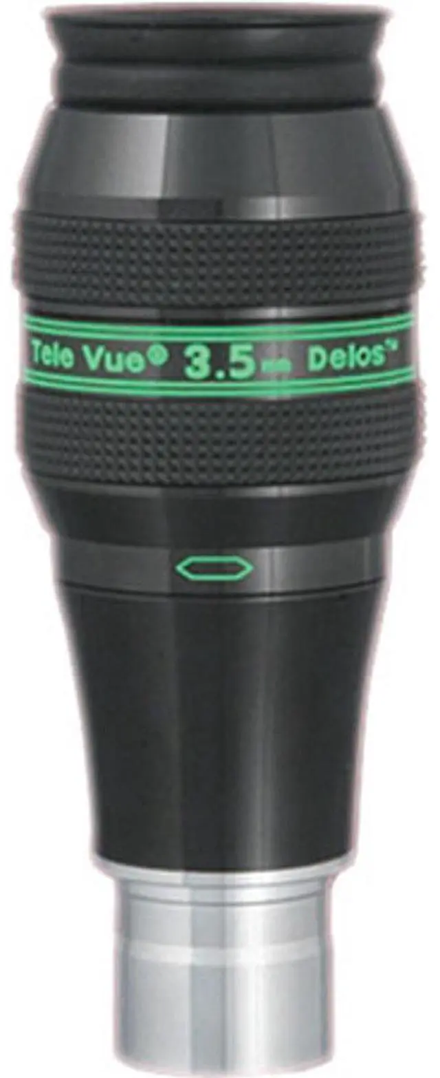 The Tele Vue Delos 3.5 mm 72deg. Eyepiece is a compact durable wide field telescope eyepiece designed for lunar and planetary observations. Wide pupil diameter and adjustable eye relief make this eyepiece ideal for comfortable long duration observation sessions. Contrast is enhanced by an adjustable height rubber eyecup that prevents stray light from degrading the image transmitted through the ocular. Anti reflection multicoated optics ensures bright, high contrast, color faithful images from edge to edge.