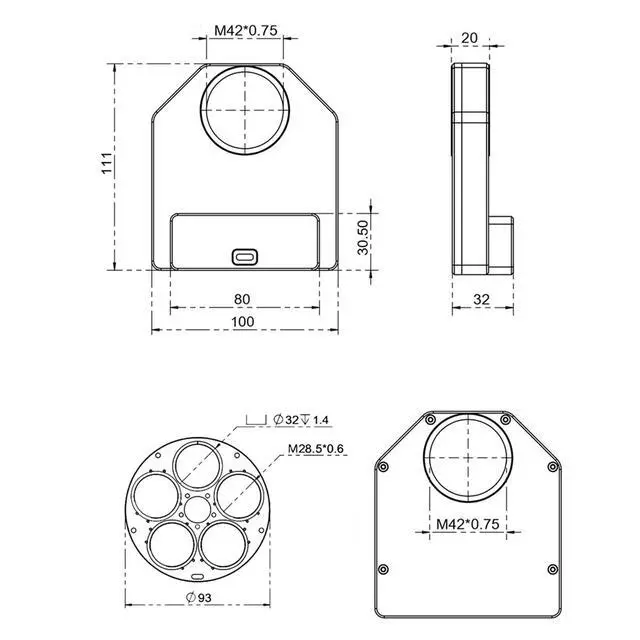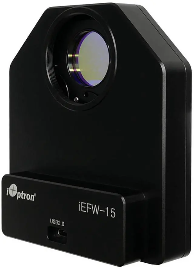 The iOptron iEFW-15 Electronic Filter Wheel provides automated control of up to 5 filters. It works with mounted 1.25" filters or unmounted 31mm filters. It is powered and controlled through a USB-C type port connected to a computer.