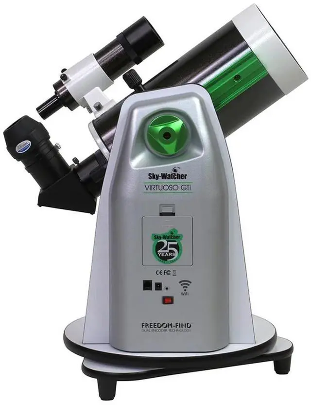 The 25th Anniversary Virtuoso GTi mount is engineered to effortlessly navigate the night sky. It automatically slews to over 10, 000 celestial objects with the free SynScan app, which also offers user-friendly tours and information on over 42, 000 objects with the optional hand controller. Sky-Watcher's patented Freedom-Find technology allows you to manually adjust the mount without losing alignment, offering a seamless stargazing experience. The optical tube of this SkyMax 127 Virtuoso GTi telescope features a vixen-style dovetail, compatible with most standard astronomy mounts. The base can also be attached to a standard photographic tripod, offering multiple configuration options for your celestial exploration.