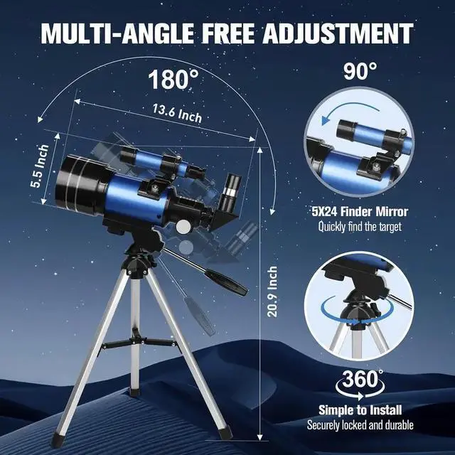 Easy to Assemble and Use: The telescope is easy to assemble even for astronomy beginners and kids. We have the detailed installation manual and video installation instructions to teach you. And our telescope is easy to focus, allowing kids to quickly find targets and see clear images. The telescopre is great for 8-12 kids and it's good gift to send your children.