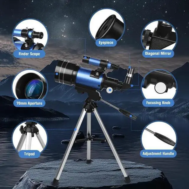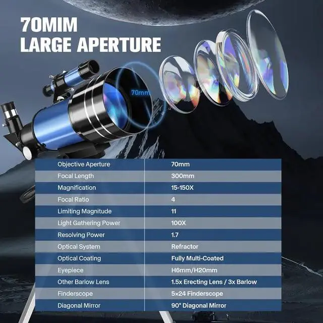 - 70mm Large Aperture: The refractor telescope is equipped with a large 70mm objective lens and the lens is fully coated with high transmission coatings. The high transmission optics lens can increase light transmittance and reduce the reflection of light. The bigger the aperture is, the bigger the field of vision will be, so you can see the clearer and brighter images. Professional astromomy telescope can help adults & 8-12 kids view the planets and stars more easily.