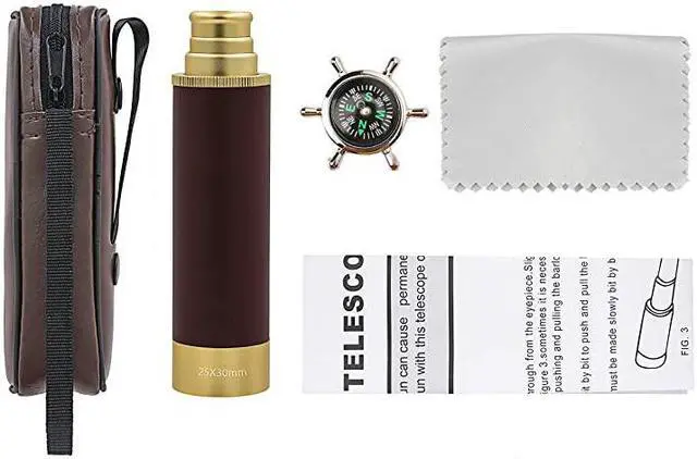Package Includes: Collapsible Pirate Telescope*1 Compass*1 Lens Cloth*1 Leatherette Case*1 User Manual*1