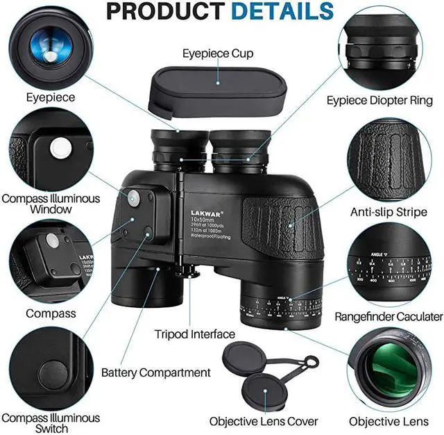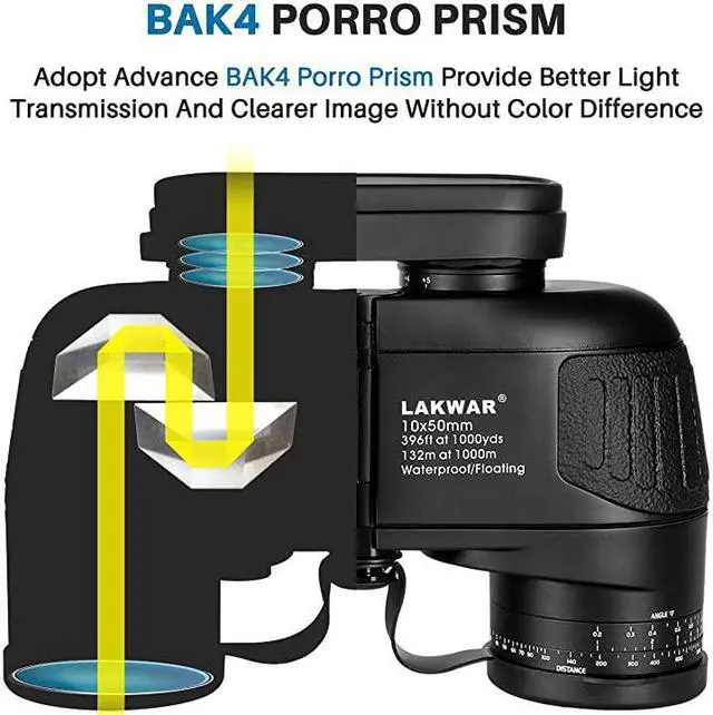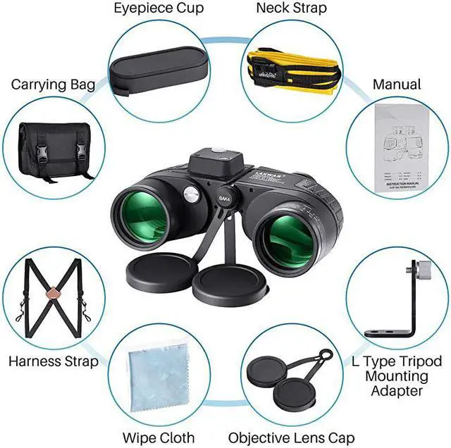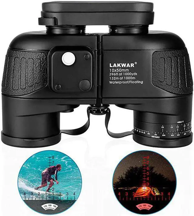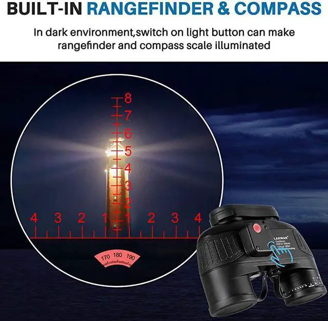 ***** **********Best Quality Guranteed. *****Navigation rangefinder compass- Illuminated Compass built-in for direction location and internal rangefinder for determining distance and size of objects. A switch in the binoculars compact used in darkness to bright the internal rangefinder scale. *****Premium BAK4 prism - Fully multi-coated optics and BAK4 prism produce clear and bright image. Porro prism system provides a wide field of view, improves light transmission. Professional opticsoffering excellent users experience. *****Tripod Connector is included - Tripod adapter fitting to tripod mounting for increased stability, can be used in many conditions, such as for hunting, marine, bird watching, boating, fishing and so on.