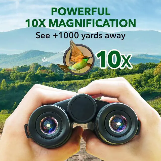 POWERFUL BIRD WATCHING BINOCULARS - Birding Binoculars for adults and kids are the perfect combination of high-powered optics, durability, and pocket-sized convenience! The powerful binoculars have a rugged weather-resistant build, Fixed 10X magnification focus, and multi-coated lens that are ready for any and every adventure you go on! LONG RANGE BINOCULARS FOR ADULTS WITH FIXED 10X MAGNIFICATION - Powerful 10X magnification and a field of view of 87m / 1000m (285 ft / 1094 yards). With the big view binoculars, you can quickly see subjects and details far and wide with crisp, clear precision! Ideal to use as binocular for hunting archery, binoculars bird watching, binoculars for adults whale watching, hiking binoculars, wildlife viewing scope, concerts, and much more! BIRDING BINOCULARS WITH MULTI-COATED LENS - compact binoculars for adults high quality, high-performance, multi-coated binocular glasses.
