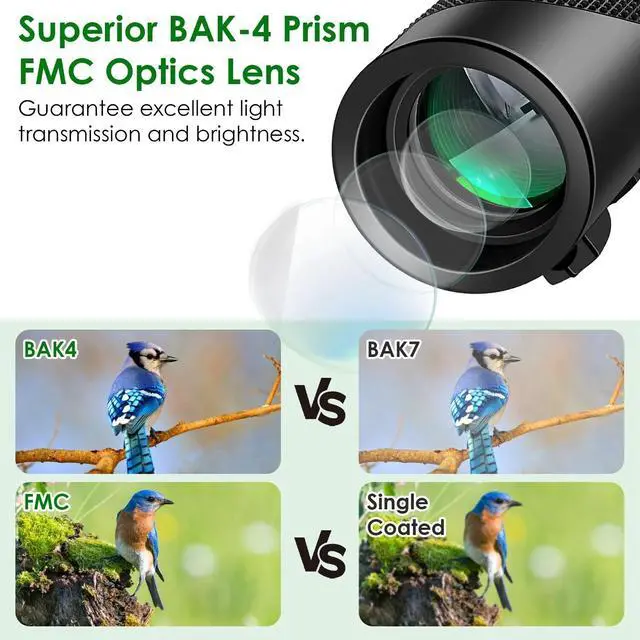 - Large BAK-4 Prism & Premium FMC Lens Coating:Featuring a BAK-4 prism and advanced FMC 5-layer broadband coating,this 80x100 HD monocular telescope increases the amount of light transmission and reduces unnecessary light reflection,and provides clear,high-contrast,true-to-color images at the same time. The monocular performs well under various lighting conditions,and its low-light night vision capability enhances usability in dim environments.