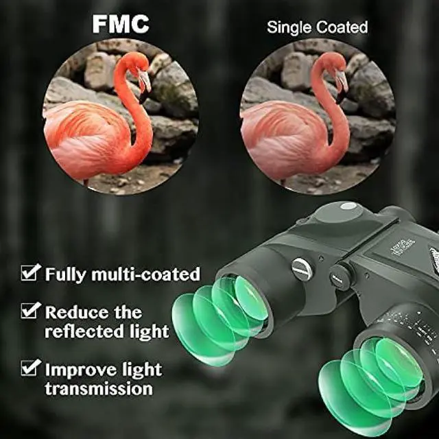 BAK4 Binoculars: High refractive index BAK4 Porro Prism eliminates the stray light and improves color reproduction to 99.99 %. Green FMC anti-reflective coating reduces the reflected light in the objective lens and improves light transmission, image brightness and image sharpness.