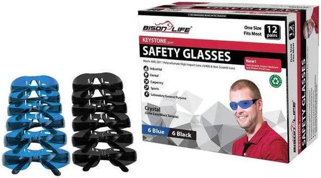 Experience top-notch eye protection with the Bison Life Key Stone Series Safety Glasses. This set includes 12 pairs of glasses, featuring color-tinted lenses with black temples. Crafted with durable, ultra-light polycarbonate, these shatterproof lenses exceed ANSI Z87.1 standards, offering superior impact resistance. Each lens is specially coated for anti-scratch protection, ensuring long-lasting clarity and performance. Designed for comfort, these safety glasses feature universal-fit temples, eliminating slippage and discomfort. Their wrap-around design ensures full coverage, protecting both your direct and peripheral vision during various tasks. With UV 400 protection, these glasses block harmful UV rays, making them ideal for outdoor work or activities. Perfect for industrial jobs, construction, sports, and laboratory environments, the Bison Life Key Stone Series provides comprehensive, reliable eye protection.