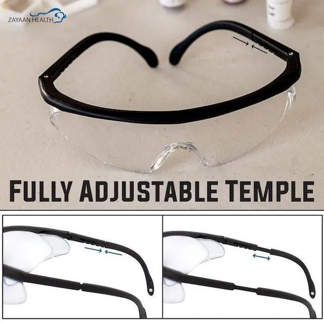 The Zayaan Health by Bison Life Simone safety glasses combine modern design with superior functionality, offering a stylish and effective solution for eye protection. Lightweight and packed with features, they are an ideal choice for both standalone use and over-the-glass (OTG) protection with prescription eyewear. The adjustable, extendable temples ensure a comfortable fit and create a suitable gap between the safety glasses and prescription lenses for enhanced comfort. Equipped with a uni-lens design, built-in side shields, and anti-fog and anti-scratch coatings, the Simone safety glasses provide comprehensive protection and clear vision. With their lightweight, flexible frame and UV protection, these glasses are perfect for all-day wear in various settings. The thin, adaptable temples provide a secure, custom fit, making them suitable for extended use across multiple environments and activities. Whether for work or recreational use, the Simone safety glasses offer the ideal blend of quality, comfort, safety, and visual appeal.