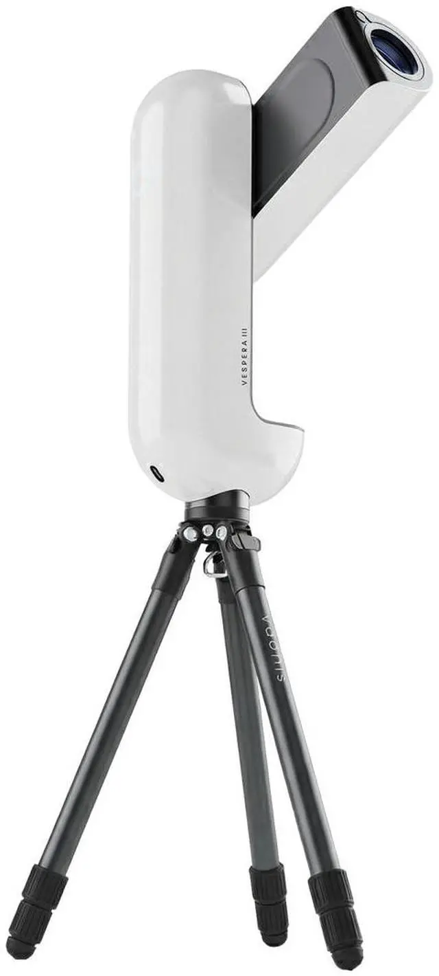 The Vespera III marks a significant evolution in smart telescope technology, prioritizing extended autonomy and high-performance optics. This 'reimagined' model features a sophisticated Apochromatic quadruplet Petzval-inspired optical design with a 50 mm aperture and F/ 4.9 focal ratio, specifically engineered for capturing deep-sky objects, the moon, and the sun. To support long observation sessions, the device boasts an impressive 11-hour battery life and has been upgraded with 115 GB of internalstorage. Connectivity is modernized through a USB-C port that handles both powerand high-speed data transfer, all supported by a new, more stable tall aluminiumtripod with an integrated bubble level.