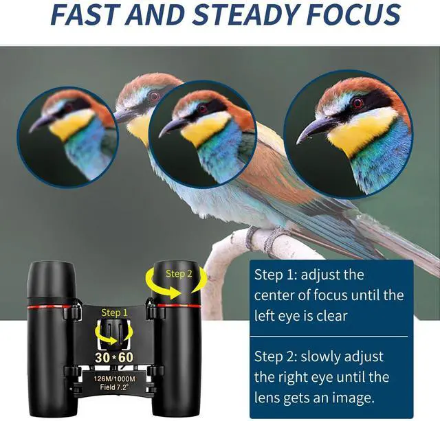30*60 mini binoculars for kids and adults are lightweight and portable foldable binoculars equipped with high quality Bak4 prisms that provide crystal clear images when viewing.These mini binoculars are made with all optical glass, multi-coated ultra-clear film FMC broadband, vivid and transparent colors, high light transmission, no chromatic aberration, clear images and easy to focus perfect for children, adults, opera, concerts, theater, shows, travel, safari, bird watching, astronomy, camping, hiking, outdoor hunting, watching shows, walking, rock climbing, soccer basketball and other outdoor recreational activities . It's also great for kids on family outings for hiking or camping. FMC Optical Green Film - Super Clear BAK4 Prismbinoculars are made with all-optical glass to reduce light loss and glare while providing superior detail and contrast. The multi-coated FMC optical green film and ultra-sharp BAK4 prisms provide vivid and transparent colors, high light transmission, no chromatic aberration, clear images and fast focus. Professional High Definition Binoculars:High-definition vision - Binoculars with high-end lens coatings provide excellent high-contrast images with excellent color reproduction, so you can see every detail in any situation you encounter during bird watching for quick and easy identification. Easy to focus - The center focus mechanism is used for easy adjustment and fast focus, Folding binoculars are centrally configured with a roller system for precise adjustment, Adjustable eye width makes this optical binoculars suitable for adults and children. Super HD Vision:Super Bright and Clear Images. See more detail with a wide 1000-yard field of view that delivers crisp, high-contrast and color-accurate images.60mm objective lens and 126M/1000M large field of view, can help you observe a clear face beyond 410 feet,Perfect for outdoor activities such as bird watching, hunting, hiking, climbing, driving, traveling, wildlife and scenery viewing. compact binoculars:Pocket size - perfect for carrying anywhere Compact binoculars clear field of view and high resolution images compact, simple design, light weight, can be folded also comes with a neck strap and carry bag, easy to store and carry. Anti-slip design using non-slip natural rubber material, with non-slip pattern on the back, lightweight binoculars more durable and user-friendly, so you can more firmly control it, without worrying about the binoculars will fall down when children use. Lightweight Small Binoculars:Light Weight & Small Size,The compact binoculars measure 7.13 x 4.09 x 1.89 inches ,
