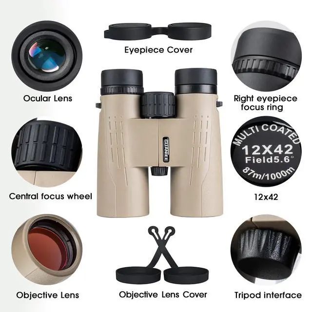 12X MAGNIFICATION HIGH-POWERED BINOCULARSThe 12x binoculars for adults high-powered with 42mm objective lens provides wide field of view, 383ft/1000yds, high definition without blurred image. You can easily get a clear and large vision from more than 650 feet away