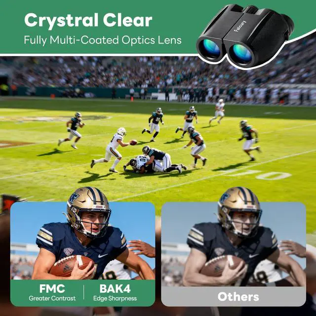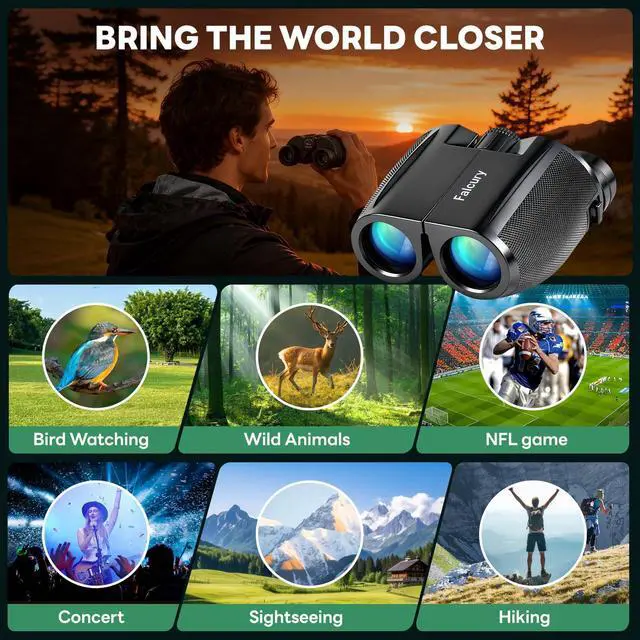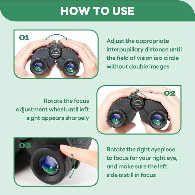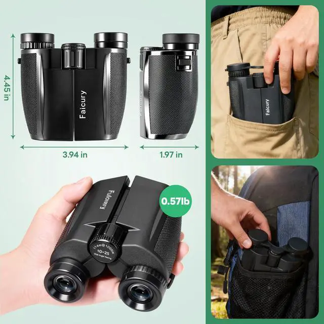 Discover crisp, immersive viewing with our 10x25 compact binocularsdesigned for outdoor enthusiasts, travelers, and casual users alike. Boasting 10x magnification and 25mm objective lenses, these binoculars bring distant subjects 10 times closer while capturing ample light for bright, detailed images, even in low-light conditions like dawn hikes or evening concerts. The multi-coated optical lenses minimize glare and enhance light transmission, delivering sharp contrast and true-to-life colors that make birdwatching, hiking, sports events, or sightseeing feel vivid and up-close. Crafted as part of our portable adventure series, these binoculars prioritize convenience without compromising performance. The lightweight, ergonomic design fits comfortably in one hand or a small bag, making them ideal for on-the-go usewhether youre trekking through trails, attending a festival, or spotting wildlife during a camping trip. The non-slip rubber grip ensures a secure hold, even in wet or sweaty conditions, while the durable ABS plastic body offers resistance to minor bumps and scratches for long-lasting reliability. User-friendly features enhance usability for all ages: adjustable eye cups accommodate both eyeglass wearers and non-wearers, while the smooth central focusing wheel lets you quickly lock onto targets with precision. A built-in diopter adjustment corrects for vision differences between eyes, ensuring crystal-clear viewing for solo use or sharing with friends. Product Specifications: Magnification: 10x Objective lens diameter: 25mm Field of view: 362 feet at 1000 yards (120 meters at 1000 meters) Exit pupil diameter: 2.5mm Eye relief: 12mm Lens coating: Fully multi-coated Body material: ABS plastic with rubber armor Dimensions: 4.45 x 3.94 x 1.97 inches Weight: 0.57lbs (258 grams) Water resistance: Splash-proof (not fully waterproof) Included accessories: Nylon carrying case, neck strap, lens cloth,lens cover Perfect for everyday adventures or special occasions, these 10x25 binoculars strike the perfect balance between power, portability, and affordability. Whether youre exploring nature, cheering on your favorite team, or admiring scenic views, theyre your reliable companion for bringing the world closerone clear view at a time.