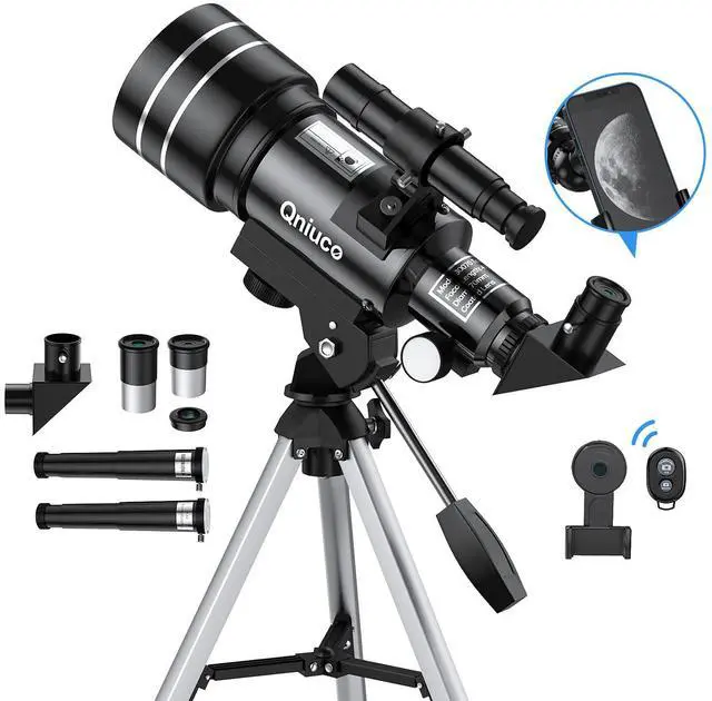 Set of Telescope, 70, 400mm, 150, Manual Focus, Reflex, Barlow, Wireless smartphone control, high magnification range, and easy object location with finderscope, 40070, Qniuco