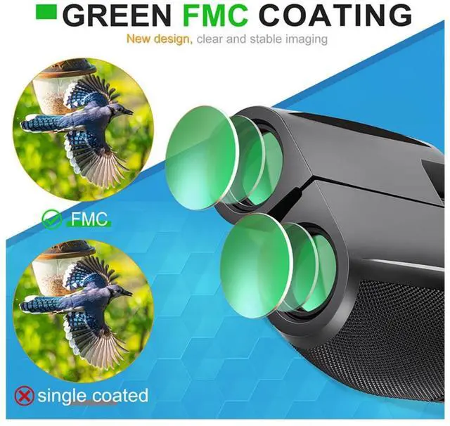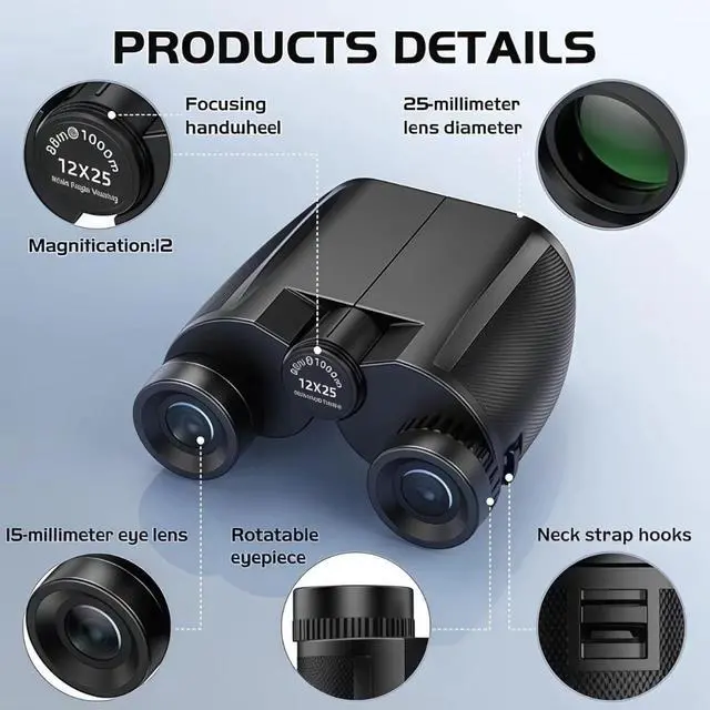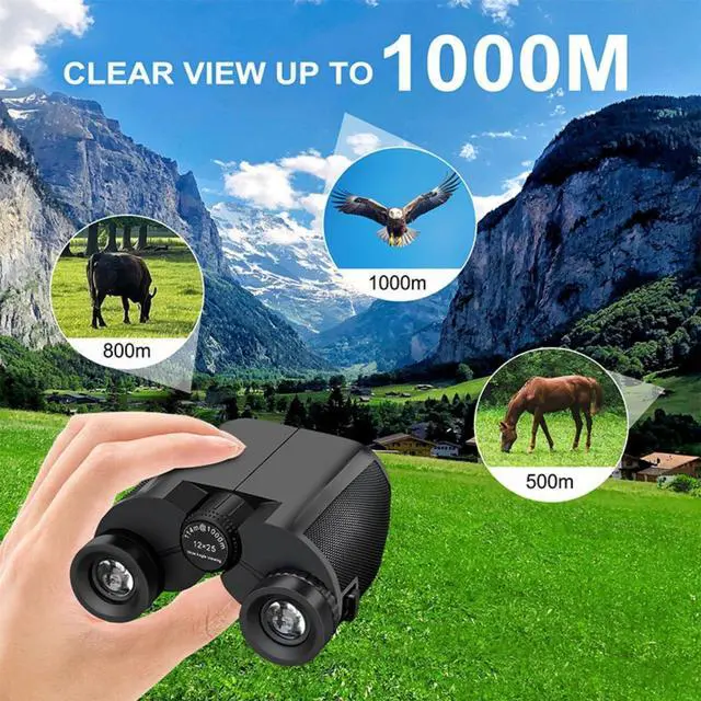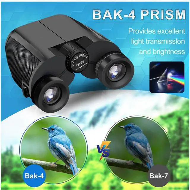 Crystal Clear Vision No Blur, No Washout 12x25 high-power binoculars with 12x magnification and a 374ft/1000yd wide field of view.Featuring premium BAK4 prisms and fully multi-coated FMC lenses, they deliver bright, sharp, color-accurate images even in low light at dawn or dusk.See every detail clearly for bird watching, concerts, sports, and golfno fuzzy edges, no dark spots.