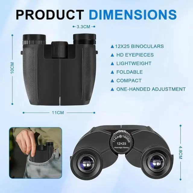 Ultra-Light & Pocket-Sized Take Anywhere At only 0.57 lbs and compact 4.29"L x 3.93"H x 1.89"W, these binoculars fit easily in your pocket or backpack.No heavy, bulky gear weighing you down.Perfect for hiking, camping, travel, and sightseeinglight enough for all-day use.