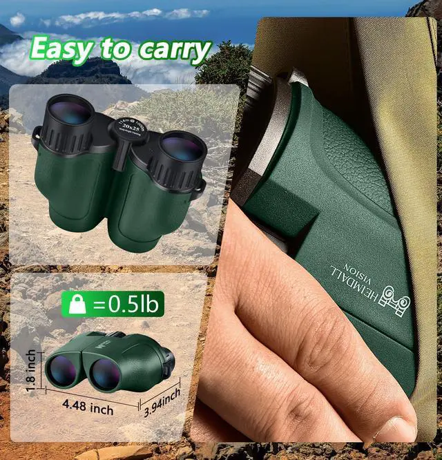 Pocket-sized and weighing just 0.5 pounds, the small binoculars is your ideal travel companions. Their dimensions (3.94 inches length, 3.74 inches width, 2.48 inches height) make them easy to stow in bag or pockets.