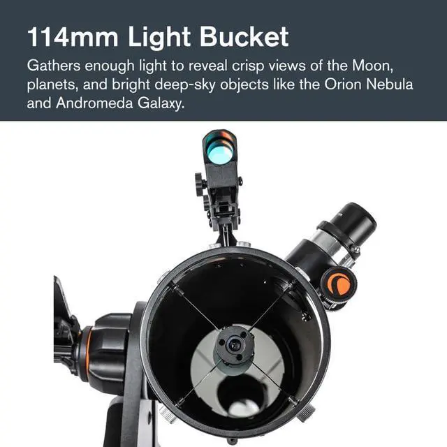130MM REFLECTOR WITH IMPRESSIVE VIEWS: The 5" Newtonian reflector with high-reflectivity coatings delivers sharp, vivid views of the Moon, planets like Jupiter and Saturn, and deep-sky favorites like the Orion Nebula and Andromeda Galaxy.