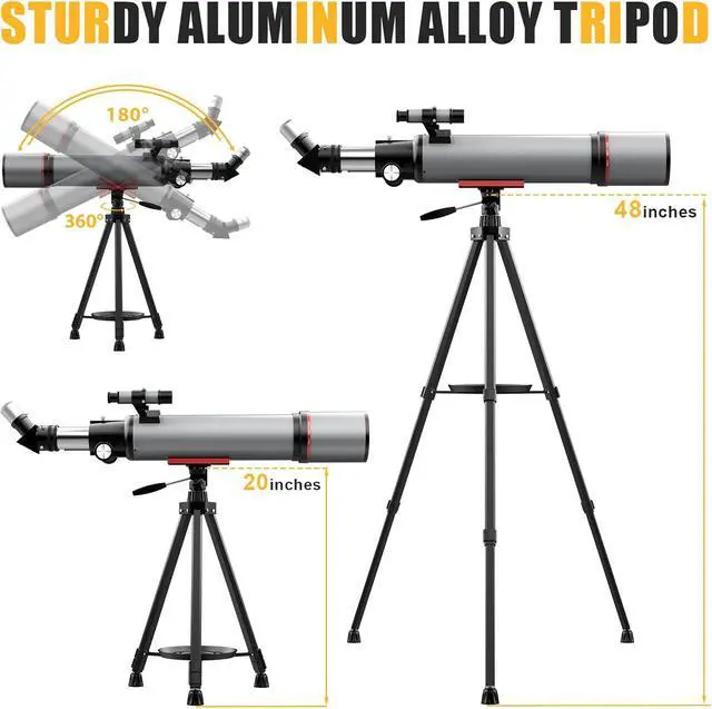 4 Flexible Magnifications (30x to 180x) For All AgesIncludes a 10mm and 25mm eyepiece, plus a 3x Barlow lens, allowing you to switch between 30x, 60x, 90x, and 180x magnification. Kids can enjoy wide, easy views of the moon, while adults can zoom in on planetary details. A truly versatile telescope that makes astronomy fun for the whole family.