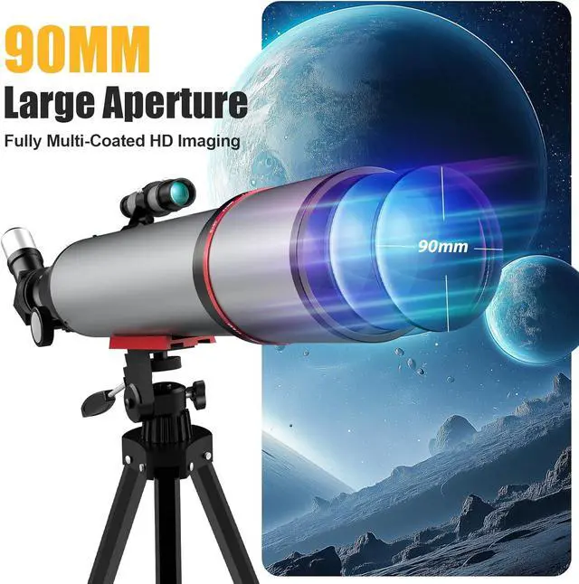 90mm Aperture Refractor Telescope Explore the Moon & PlanetsDesigned for aspiring astronomers, this high-powered telescope combines a 90mm large aperture with a 600mm focal length for exceptional brightness and clarity. Capture stunning details of the moons craters, Saturns rings, Jupiters cloud bands, and brighter deep-sky objects. Perfect for beginners, yet capable enough for growing enthusiasts.
