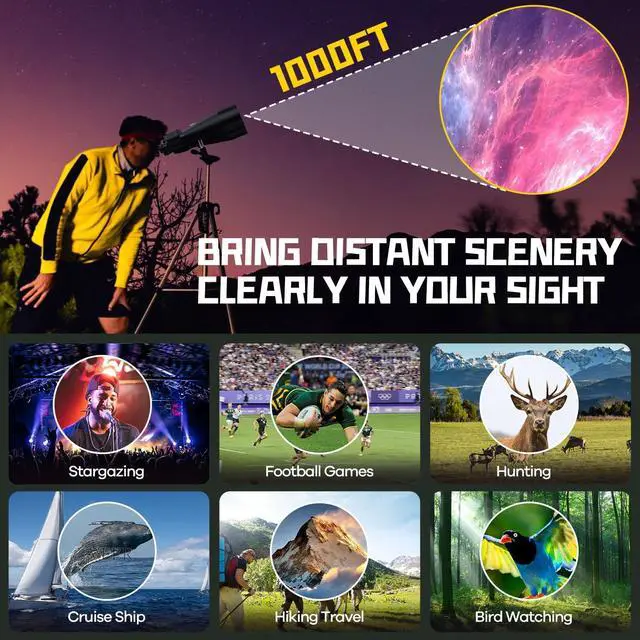WATERPROOF & TOUGH HUNTING GEAR: IPX7 waterproof armor survives monsoons, ocean spray, or hunting gear mud. Non-slip rubber grip ensures stability during marine adventures, even when tracking targets as close as 73.8-95.1ft. For long-distance birdwatching, stargazing, sports action, or spotting whales on Alaska cruises.
