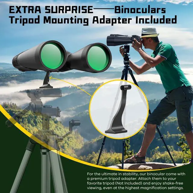 TRIPOD ADAPTER FOR STEADY VIEWING: Discover the Wonders of the Universe in Stunning Detail. For the ultimate in stability, our binocular come with a premium tripod adapter. Attach them to your favorite tripod (Not Included) and enjoy shake-free viewing, even at the highest magnification settings.