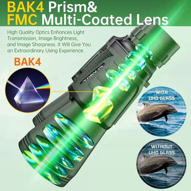 SUPERIOR IMAGE CLARITY - Multilayer-coated aspherical lens elements ensure superior light transmission with minimal distortion, enhancing image brightness, contrast, and overall quality. The BAK4 Porro prism, with its high refractive index, achieves 99.8% light transmission for improved color accuracy. The green FMC (Full Multi-Coating) anti-reflective coating on the objective lens reduces reflected light, further boosting light transmission, image brightness, and sharpness for an exceptional viewing experience.