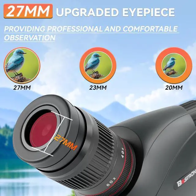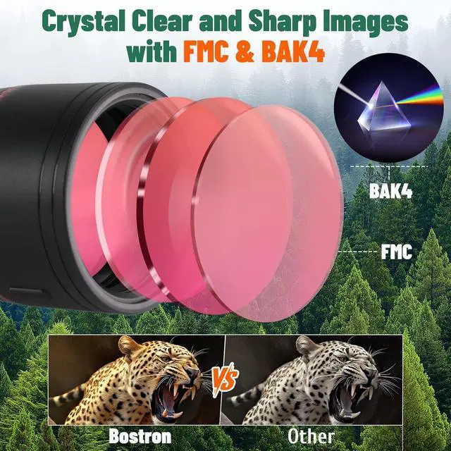 Fully Multi-coated 100mm LensThe spotting scope lens feature fully multi-coated and BAK4 roof prism to increases light transmission and delivers bright and clear images even in low-light conditions. 100mm objective lens of the spotting scopes provide a field of view at 123-63ft / 1000 yards. Adjust the focus, then quickly lock on to the target and zoom in
